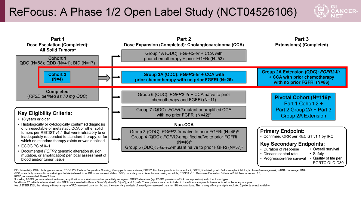 主な適格規準は、18歳以上、病理組織学的に診断された切除不能または遠隔転移胆道癌、化学療法既治療、FGFR阻害薬未治療(FGFRi-naïve)、ECOG PSは0-1、FGFR2融合/再構成陽性であった(図1)。