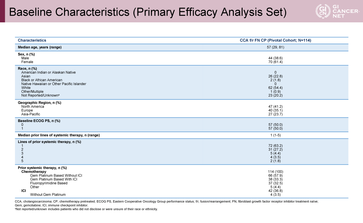 主要有効性解析集団には114例が含まれ、年齢中央値は57歳であった。女性は61.4%を占め、人種別では白人が54.4%、アジア系が22.8%であった。ECOG PSは0および1がそれぞれ50%であった。既治療ライン数は、1ラインが63.2%、2ラインが27.2%、3ライン以上が9.7%であった。前治療としては、90%以上の患者がGemcitabine系レジメンを含む治療歴を有しており、免疫チェックポイント阻害薬を含む治療歴を有する患者も3分の1強に認められた(表1)。