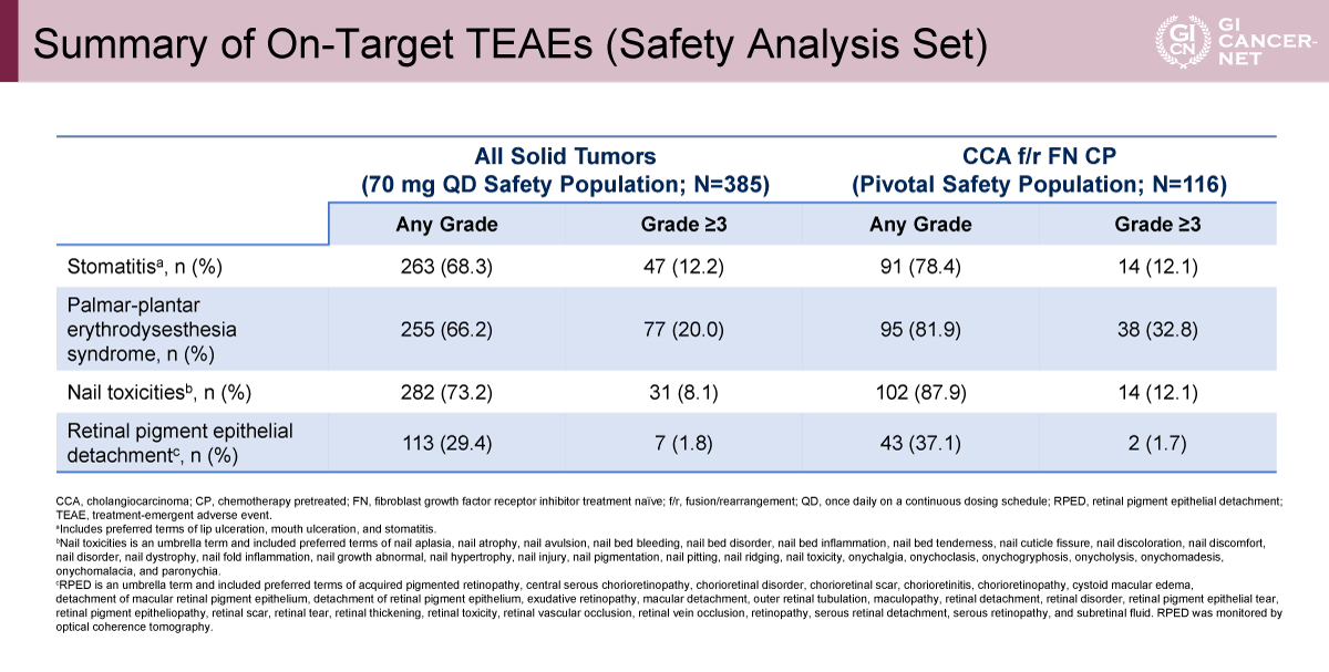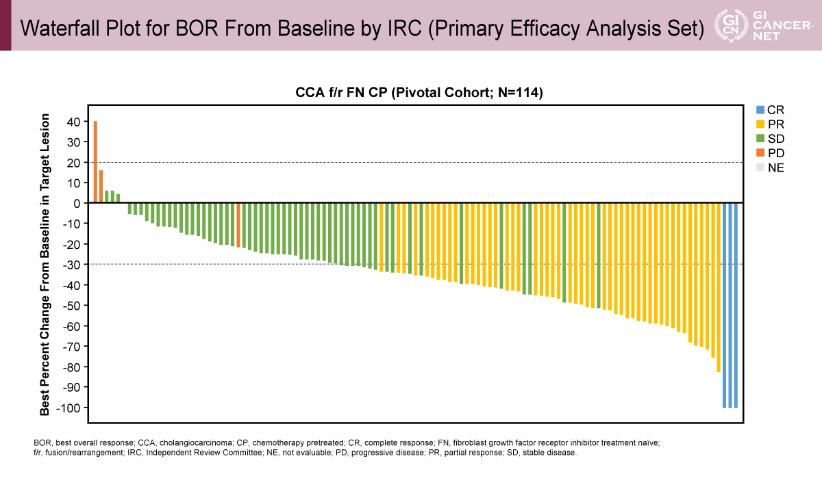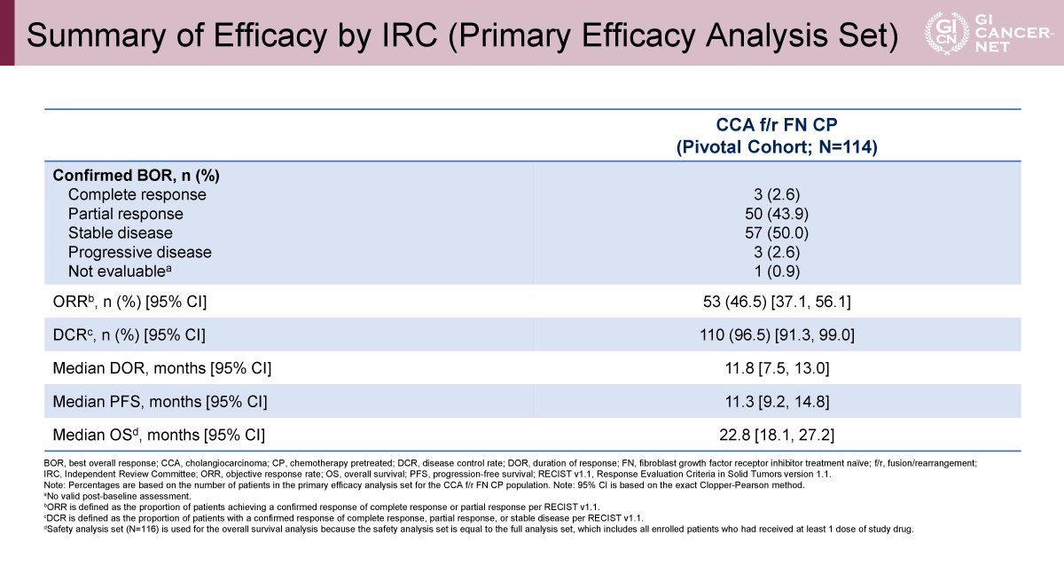 本解析により、Lirafugratinibは標準治療後に増悪したFGFR2融合/再構成陽性かつFGFR阻害薬未治療の胆道癌において、良好な奏効割合、奏効持続期間、そして管理可能な安全性プロファイルを示した。