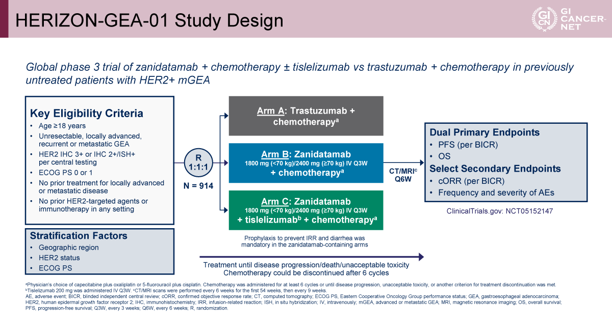 HER2陽性の進行胃食道腺癌を対象に一次治療におけるZanidatamab+化学療法(CAPOXまたはFP)の有効性を検証した第II相試験(NCT03929666)では、奏効率(ORR)75%、PFS中央値12.0カ月と、従来の標準治療を上回る可能性を示す成績が報告された3)。これらを背景に、標準治療(Trastuzumab+化学療法)を対照として、Zanidatamab+化学療法、さらにFc領域を最適化した抗PD-1抗体Tislelizumabを加えたZanidatamab+Tislelizumab+化学療法が、新たな標準治療となり得るかを検証する第III相試験として、HERIZON-GEA-01が実施された。