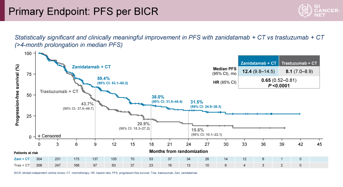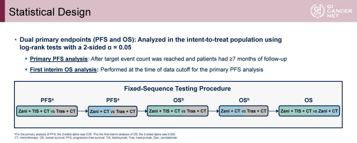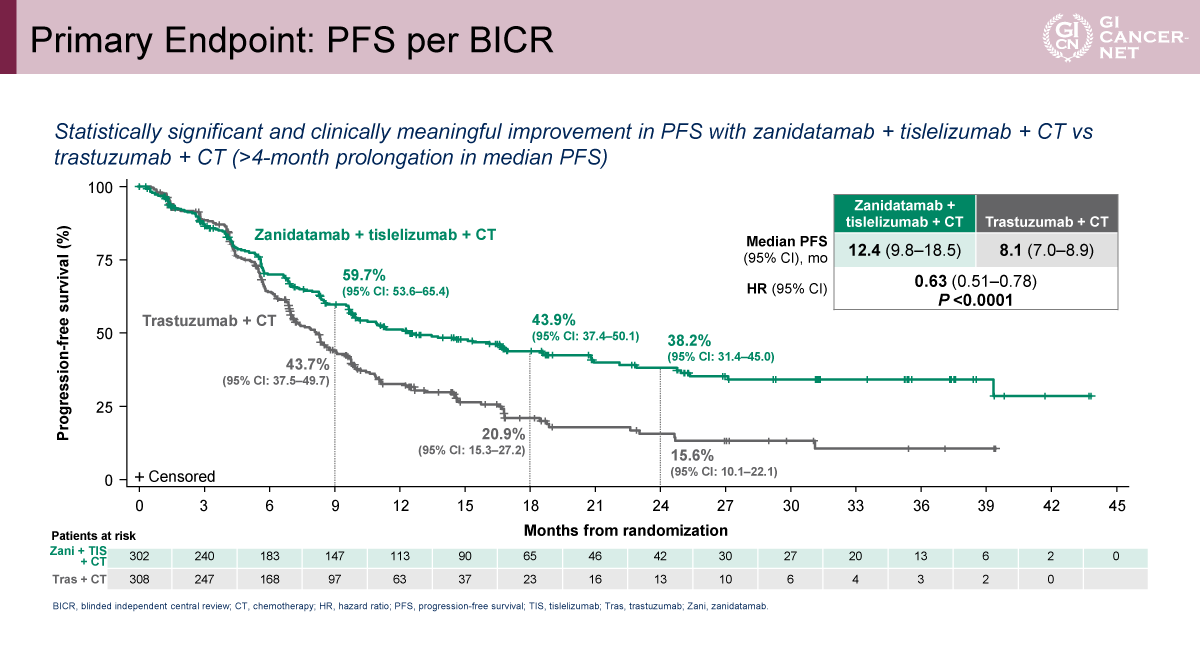 対象は計914例で、Trastuzumab+化学療法(A群)、Zanidatamab+化学療法(B群)、Zanidatamab+Tislelizumab+化学療法(C群)の3群に1:1:1に無作為に割り付けられた。