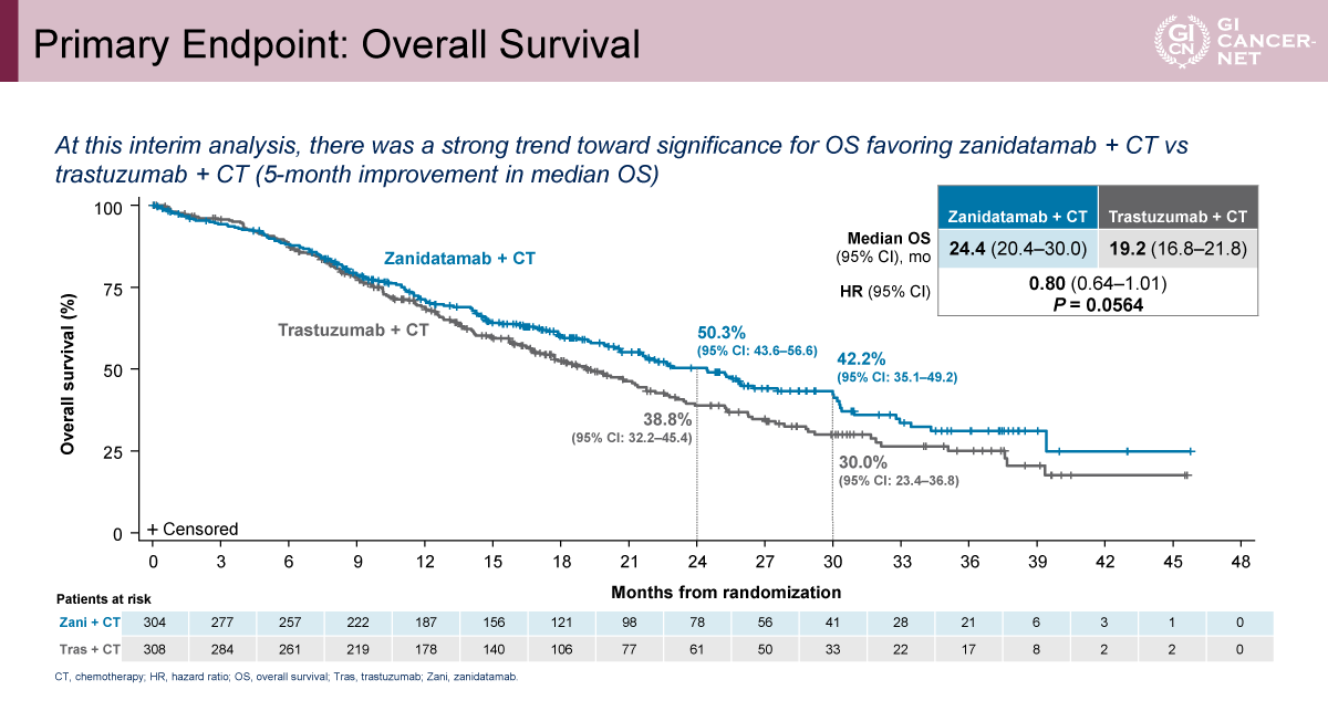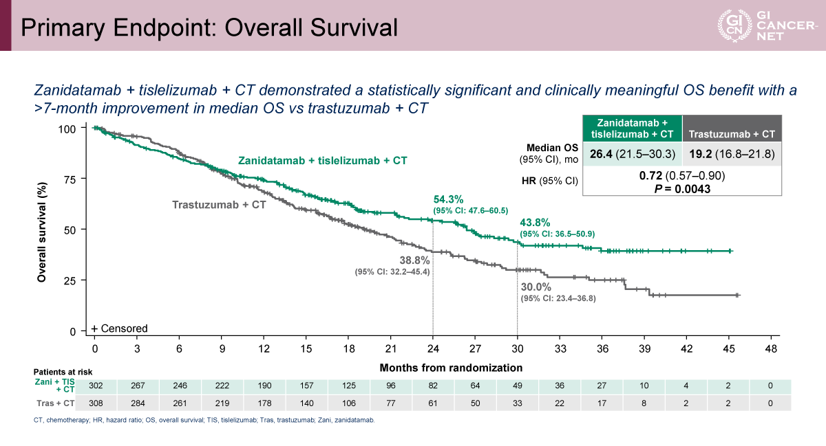 Zanidatamab+Tislelizumab+化学療法はTrastuzumab+化学療法を全生存期間で有意に上回る