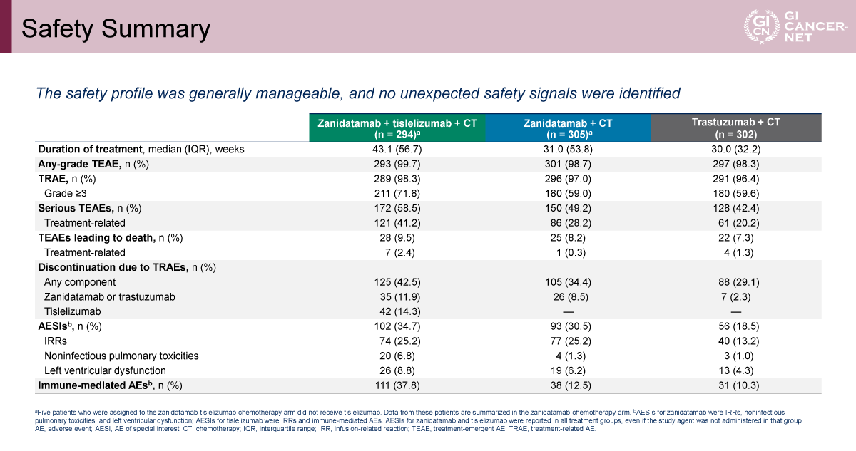 Triplet(chemo+Zanidatamab+Tislelizumab)とchemo+Trastuzumabの比較に関して、KEYNOTE-811試験との比較がポイントになる。使用する薬剤や対象の違い等があり一概に比較することはできないが、PFSにおいて本試験のHR=0.63(中央値12.4 vs. 8.1)、KEYNOTE-811試験のHR=0.73(中央値10.0 vs. 8.1)、OSにおいて本試験のHR=0.72(中央値26.4 vs. 19.2)、KEYNOTE-811試験のHR=0.80(中央値20.0 vs. 16.8)であった。本試験ではPD-L1 statusにかかわらず、PD-L1陰性相当でもICI併用群の成績が良かったが、測定した検査がTAPであること、食道腺癌が含まれていることが影響している可能性がある。また、治療成績だけではなく毒性の違いがあり、tripletでは消化器毒性の頻度が数値として高く、特に下痢の頻度が高い。下痢はマネジメント可能な毒性と報告されているが、臨床導入においては重要なポイントになるだろう。