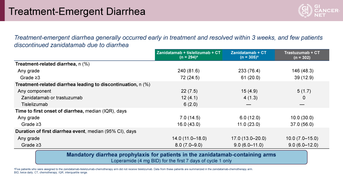 安全性については、全体として既知の各薬剤プロファイルと同様で、新規の安全性シグナルは認められなかった。しかし、grade 3以上の治療関連有害事象はA群59.6%、B群59.0%、C群71.8%であり、C群で頻度が高い傾向にあった(表1)。とくにgrade 3以上の下痢はA群12.9%、B群20.0%、C群24.5%で、A群からC群にかけて段階的に増加した。下痢に起因する治療関連の中止もA群1.7%、B群4.9%、C群7.5%と、同様の増加傾向がみられた(表2)。治療関連の下痢は概ね治療開始後約1週間で発現し、多くは3週以内に軽快する傾向が示された。Zanidatamabを含む治療群では、プロトコルで初回7日間の予防的Loperamide投与が必須とされていた。
